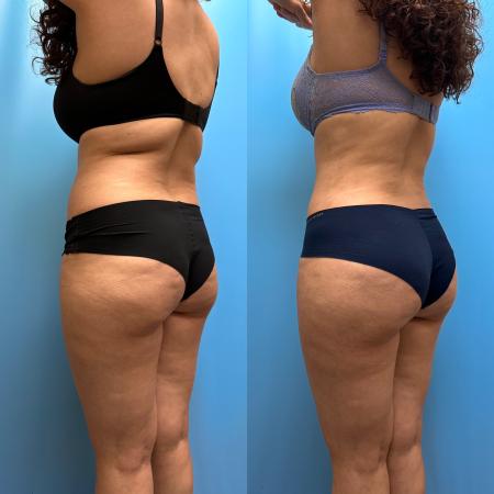 47 year old woman after tummy tuck, Lipo 360 (liposuction of the abdomen, waist, flanks, and back), Brazilian Butt Lift (fat transfer to the buttocks), and Renuvion skin tightening of liposuction sites. 650 mL of fat was transferred into each buttock.