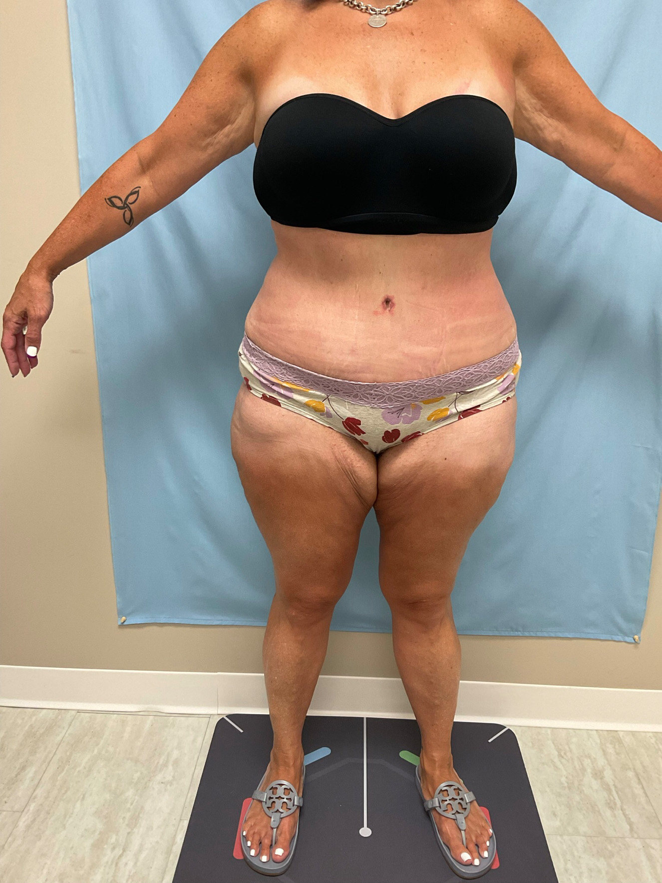This case involves a 50-year-old female patient who underwent a tummy tuck and liposuction, targeting the abdominal area, hips, and thighs. Pre-operative images display excess skin and adipose tissue in the abdomen. The left pannus weighed 2.1 lbs, while the right weighed 2.25 lbs, totaling 4.35 lbs. At one month post-operation, the after image shows reduced abdominal volume and enhanced midsection contouring. The skin appears smoother with a more defined waistline. Visible surgical markings indicate healing incision sites consistent with the expected recovery timeline. The patient's weight is recorded at 170 lbs, providing context for the physical changes achieved through this surgical approach.