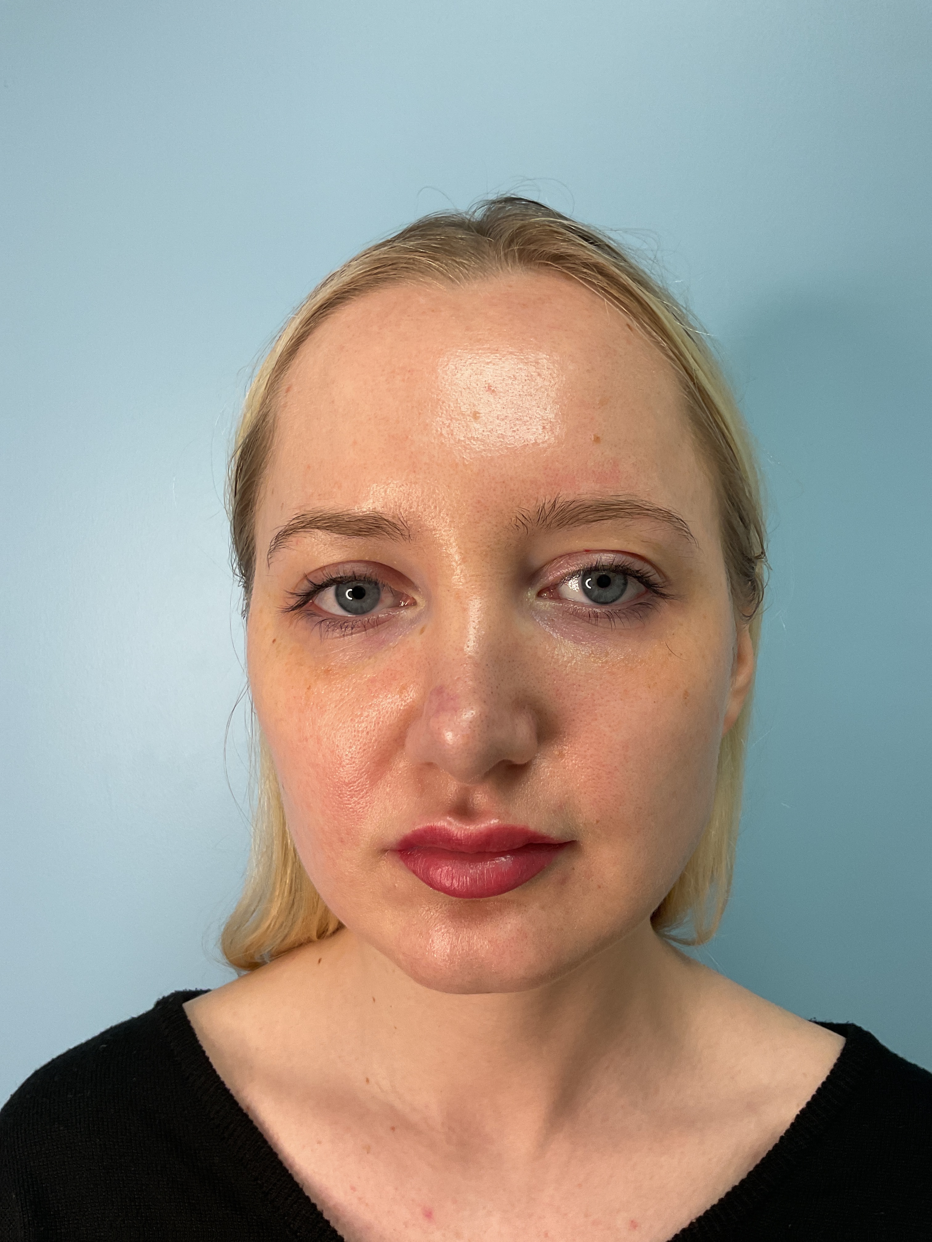 The patient, a 32-year-old female, underwent BOTOX® Cosmetic and filler treatments over a span of 2 years. Patient received 1 cc of Versa filler injections to her lips, 1 syringe of Voluma injection in each of her cheeks and 50 units of Botox injections in her forehead, neck, and masseter. The before-and-after images demonstrate changes over a 24-month period. In the post-procedure image, there is a noticeable smoothing of forehead lines and enhanced volume in the lips. Additionally, the area around the eyes appears more relaxed with reduced fine lines. The overall facial contours show subtle refinement, suggesting an increase in dermal fullness. The skin texture appears consistent with typical outcomes observed following such procedures.