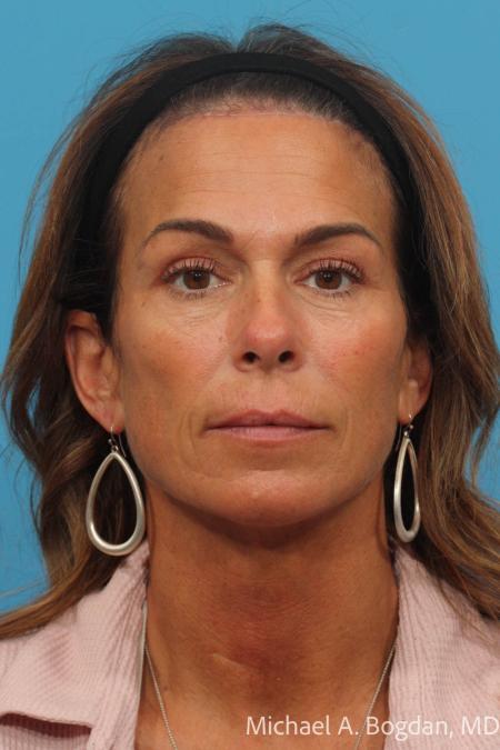This female patient in her late 50s received a face and neck lift, brow lift, upper and lower blepharoplasty, upper lip lift, and fat injections.